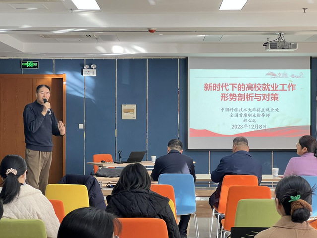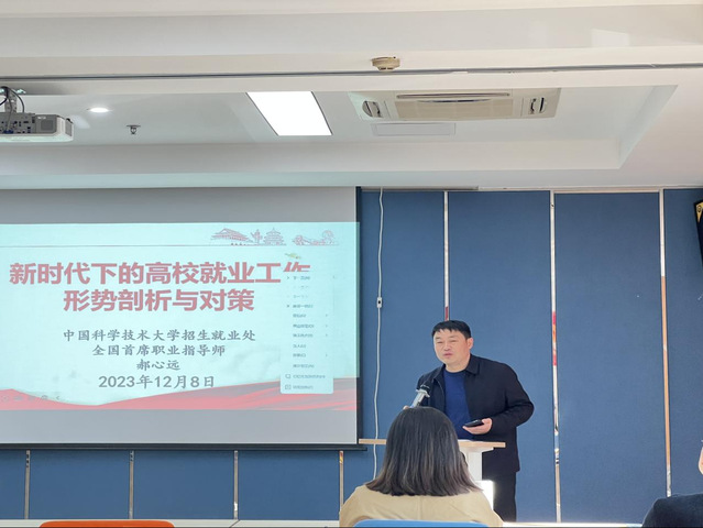 郝心远老师首先强调就业是最大的民生工程,从供需关系、考研、考公、就业等方面分析了目前高校就业现状及其严峻形势背后的深层原因,认为新形势下就业工作更要与时俱进。然后介绍了中科大的整体就业情况,并结合中科大毕业生真实就业数据,分析了科大学生求职时的地域偏好、行业偏好等学生时常困惑的问题。最后结合个人从业经历提出就业工作的四点体会、高校就业工作的机遇与思考。郝心远老师强调,要引导学生积极响应国家号召、配合国家发展战略,要始终以学生诉求为中心开展就业工作。